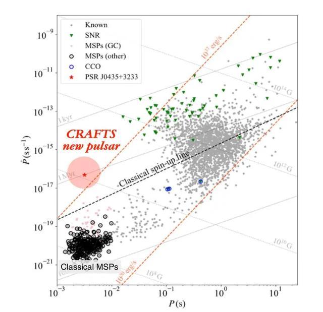 这一次其实又是发现了一颗特殊性的脉冲星,其属于毫秒脉冲星,名叫PSR J0435+3233,在研究团队发现之后,通过其研究结果显示,这一颗脉冲星跟我们大部分时候发现的完全不一样,它的自转周期居然只有后3.2毫米,周期变化率高达4.88×10^-17秒/秒,这比已知其他毫秒脉冲星的平均值高出两个数量级,这意味着其自转在“急刹车”,且自转能损率极高,表面磁场也比同类天体强约一百倍。